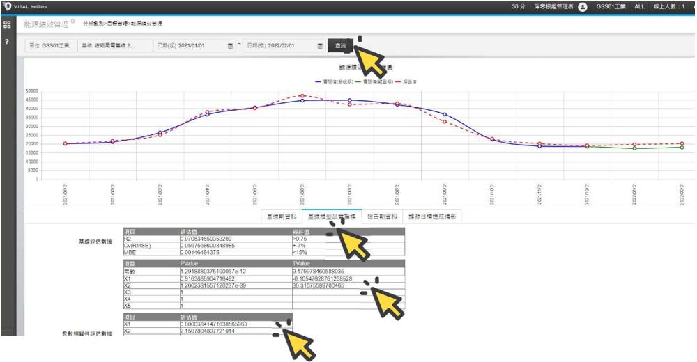 移動到畫面下方,點選左二側[基線模型品質指標]頁籤,可以查詢此基線模型的各項誤差指標以及基線變因 Xn 的關聯係數,查看是否符合工業局能源基線統計結果可接受之標準。如果發現 Xn 關聯係數過低,建議可自基線設定中進行數據移除。