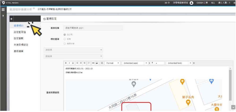 請點選左側[選擇標的],系統顯示此基線名稱與標的選項,標的選項可以是全公司的基線,或是某個設備的基線,或是能源類別的基線,並可編輯基線設定的背景資訊說明,建議包含基線起訖日期、界線範圍與能耗來源組成等說明。