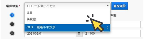 續點基線運算,挑選回歸模型,目前系統提供決策數與 OLS 最小平方法兩種 AI 非線性回歸模型可供選擇。