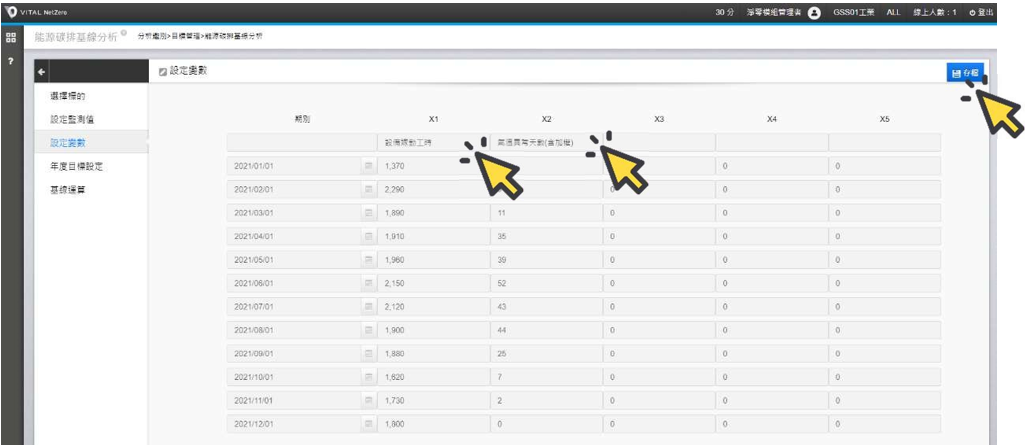 續點選[設定監測值],輸入此基線監測值 M(或是所謂回歸線的 Y 值)的實際值名稱(例如:用電度數、用油公升數)與單位(例如:kWh 用電度數或是公升數 L 或是立方米 m3)。如有任何內容變更,可按[存檔]紀錄。