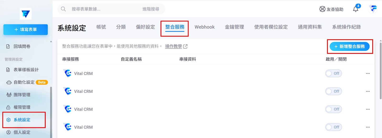 1. 請至【系統設定】>【整合服務>新增整合服務】。