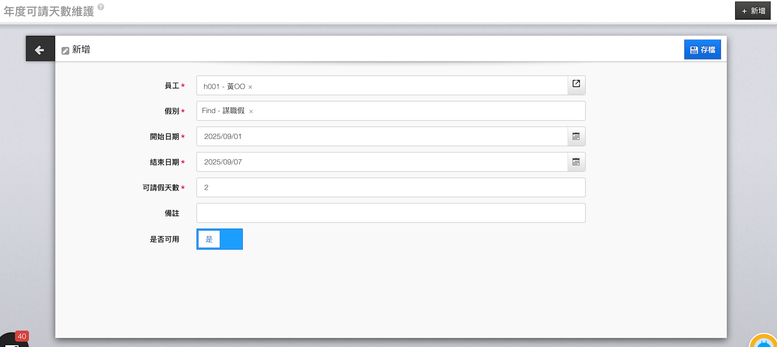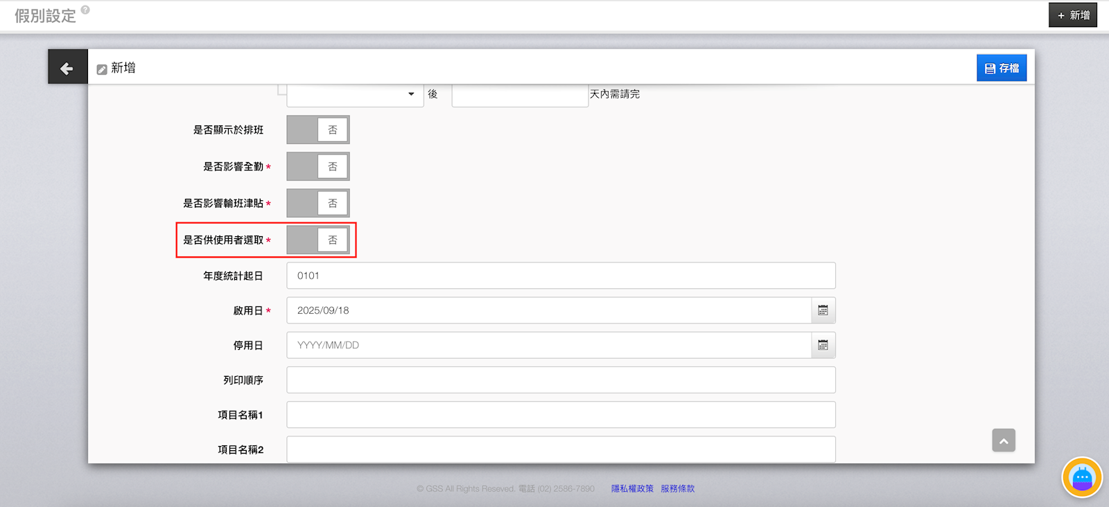 *請注意:如果不希望「謀職假」出現在請假選單上的話,在新增假別的時候【是否供使用者選取】要選擇「否」,但是員工有請假的時候就必須要由HR透過後臺幫該員工建檔請假紀錄。