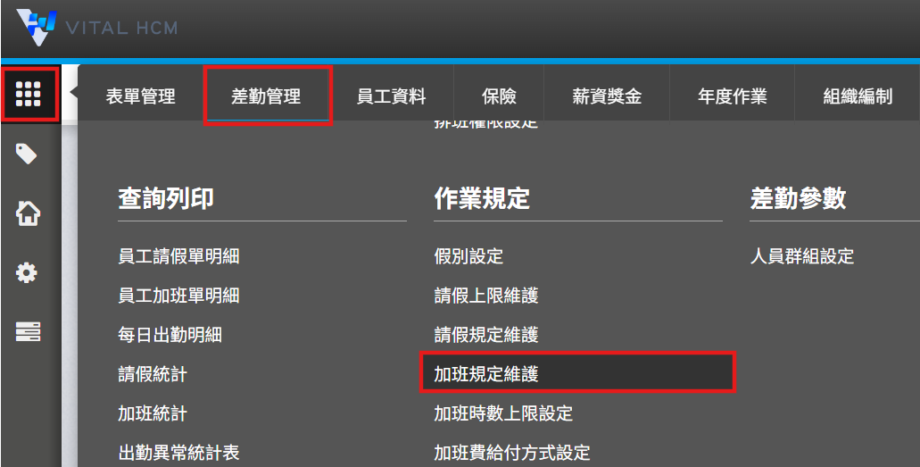 1. 請至【全站功能】>【差勤管理>加班規定維護】。