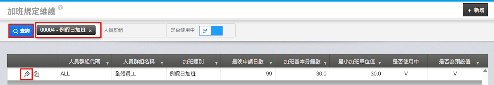 2. 篩選【例假日加班】條件後點選【查詢】,點選【鉛筆】進入編輯。