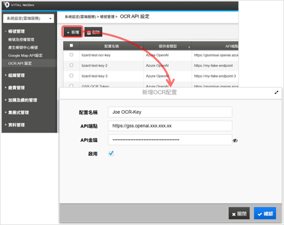 點擊左上方【系統設定】>【帳號管理】> 選擇【OCR API設定】,點擊【新增】,輸入金鑰和其他欄位後按【確認】即完成設定