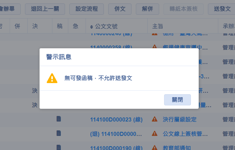 您的公文中需要有可以發文的函稿。如果您的公文只有來文而沒有新增函稿,點選送發文就會出現「無可發函稿,不允許送發文」的提示。為了解決這個問題,請您按照以下步驟操作:
