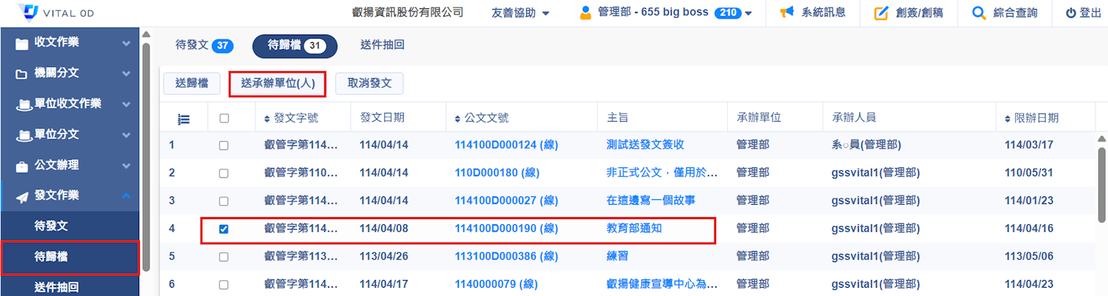 1. 已發文的公文會在發文作業>待歸檔,請在待歸檔找到公文,勾選公文後,點選【送承辦單位】