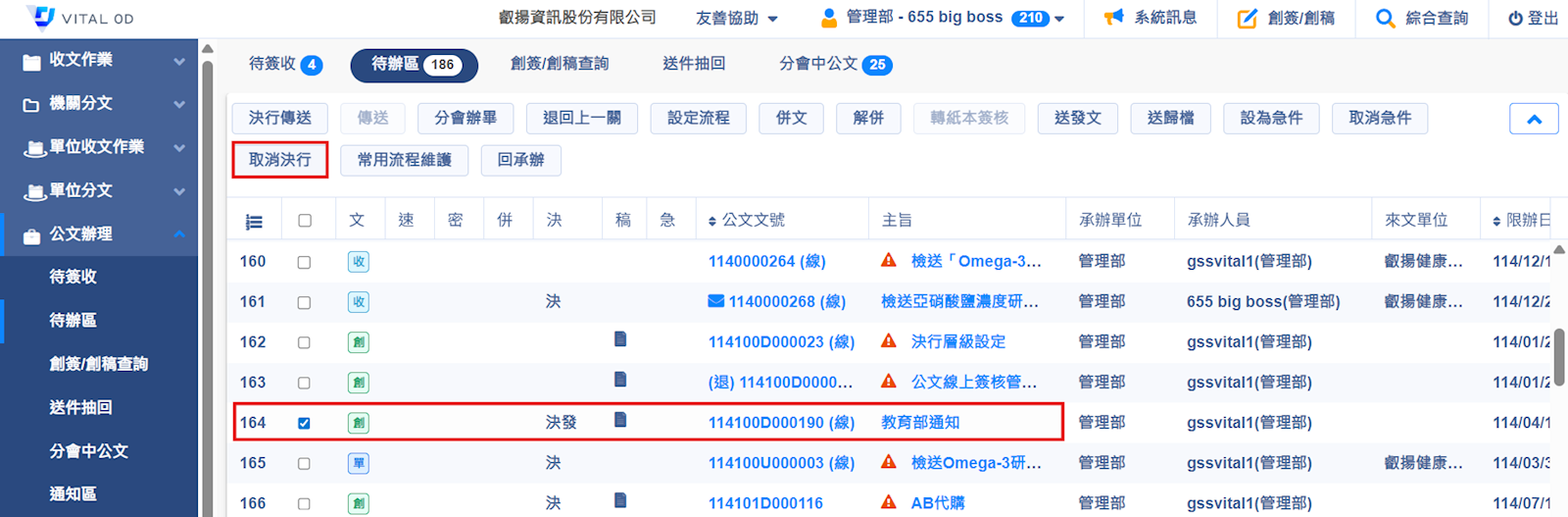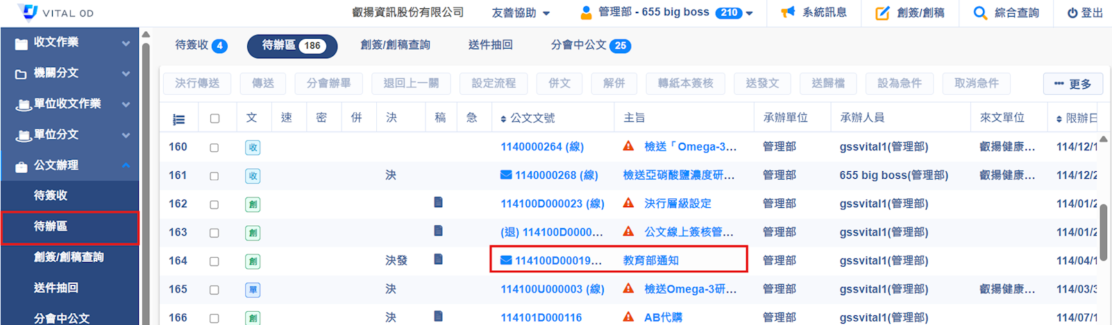 2. 公文就會回到承辦人員【待辦區】,公文前面會有像信封的圖示,需要先將公文簽收