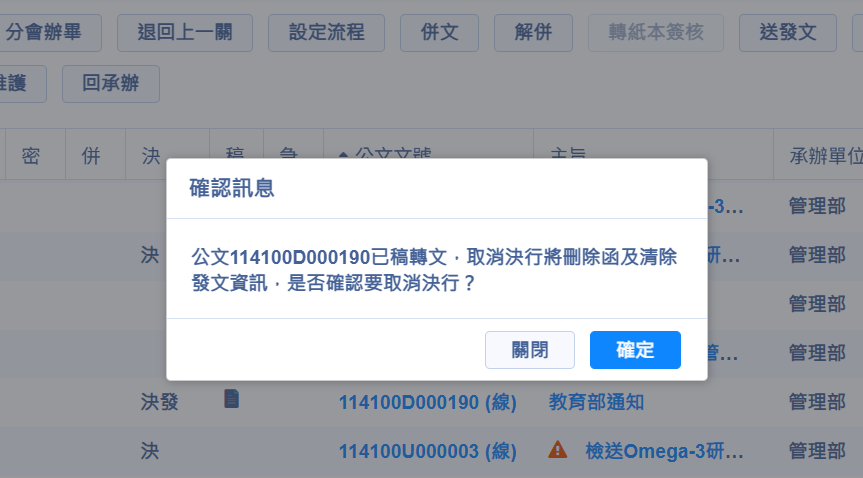 4.會出現警示訊息,請確認是否要取消決行,確認後,要請輸入取消決行原因,輸入完畢後,即完成公文取消決行。