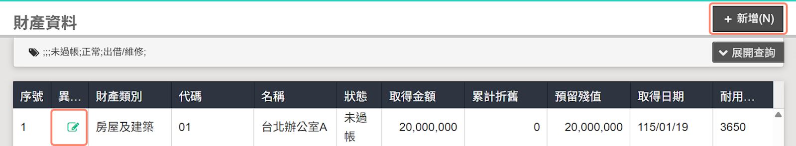 請至【財產管理>財產資料】,點選【編輯】或【新增】可修改既有資料或新增一筆資料。