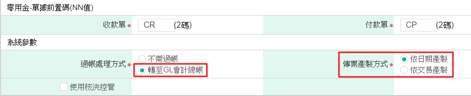 1. 請至【維護作業>系統參數設定】,在「過帳處理方式」欄位勾選「轉至GL會計總帳」,並於右側「傳票產製方式」欄位依需求選擇依日期或交易產製傳票。.png)