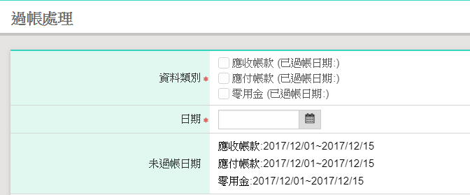 1. 請至【日常作業>過帳處理】中,勾選欲處理之資料類別、日期後,點擊右上方的【確定】按鈕即可完成。.png)