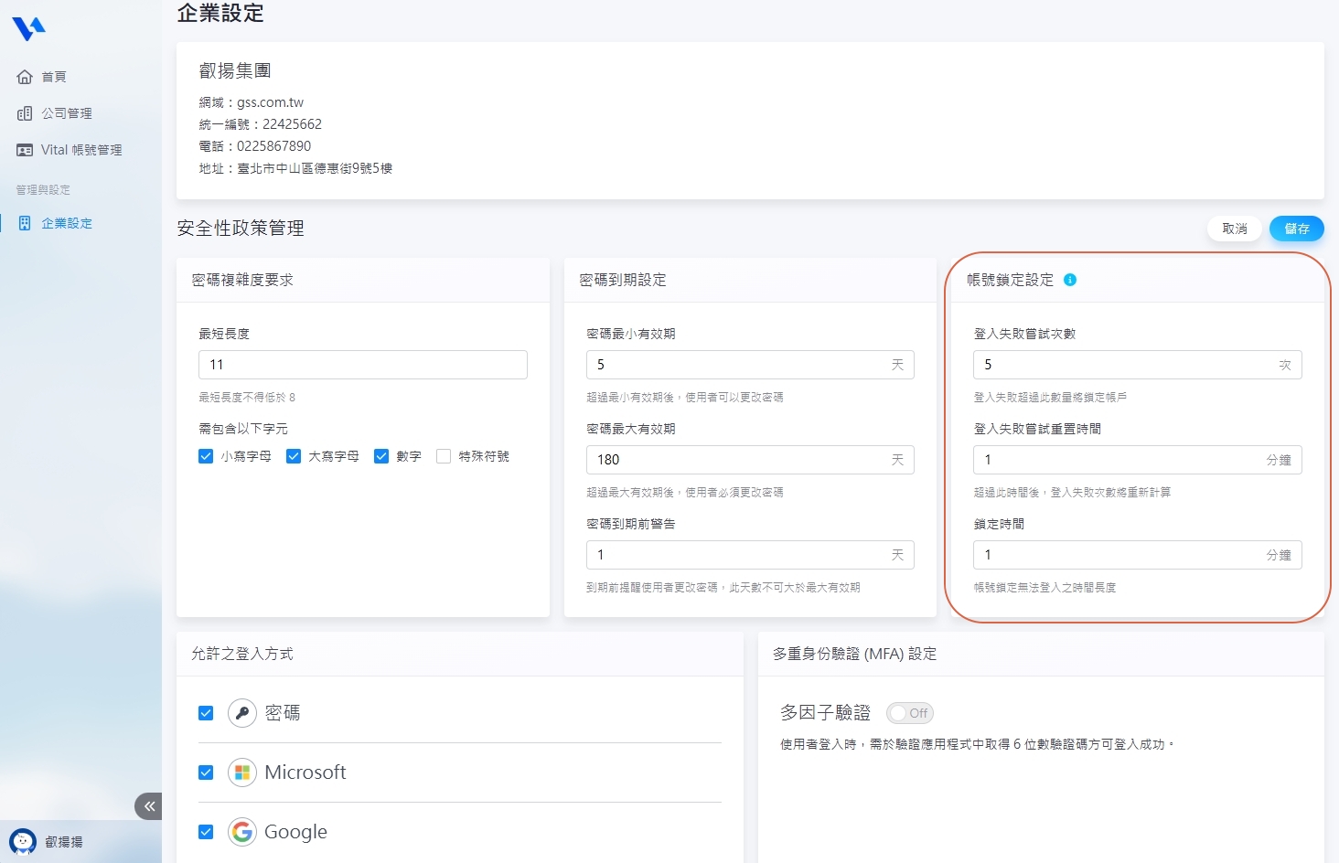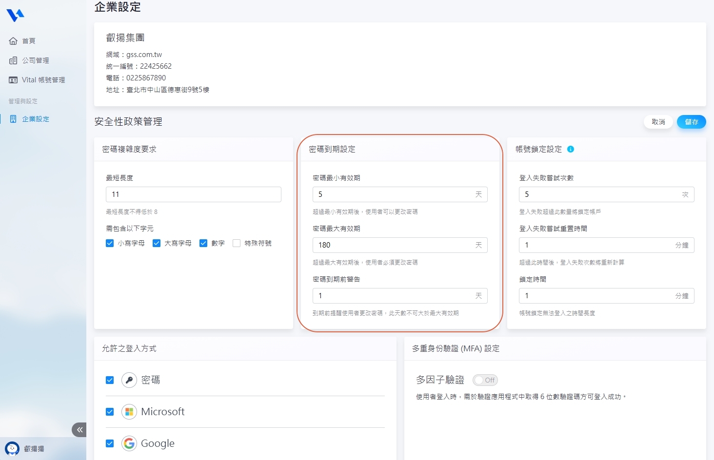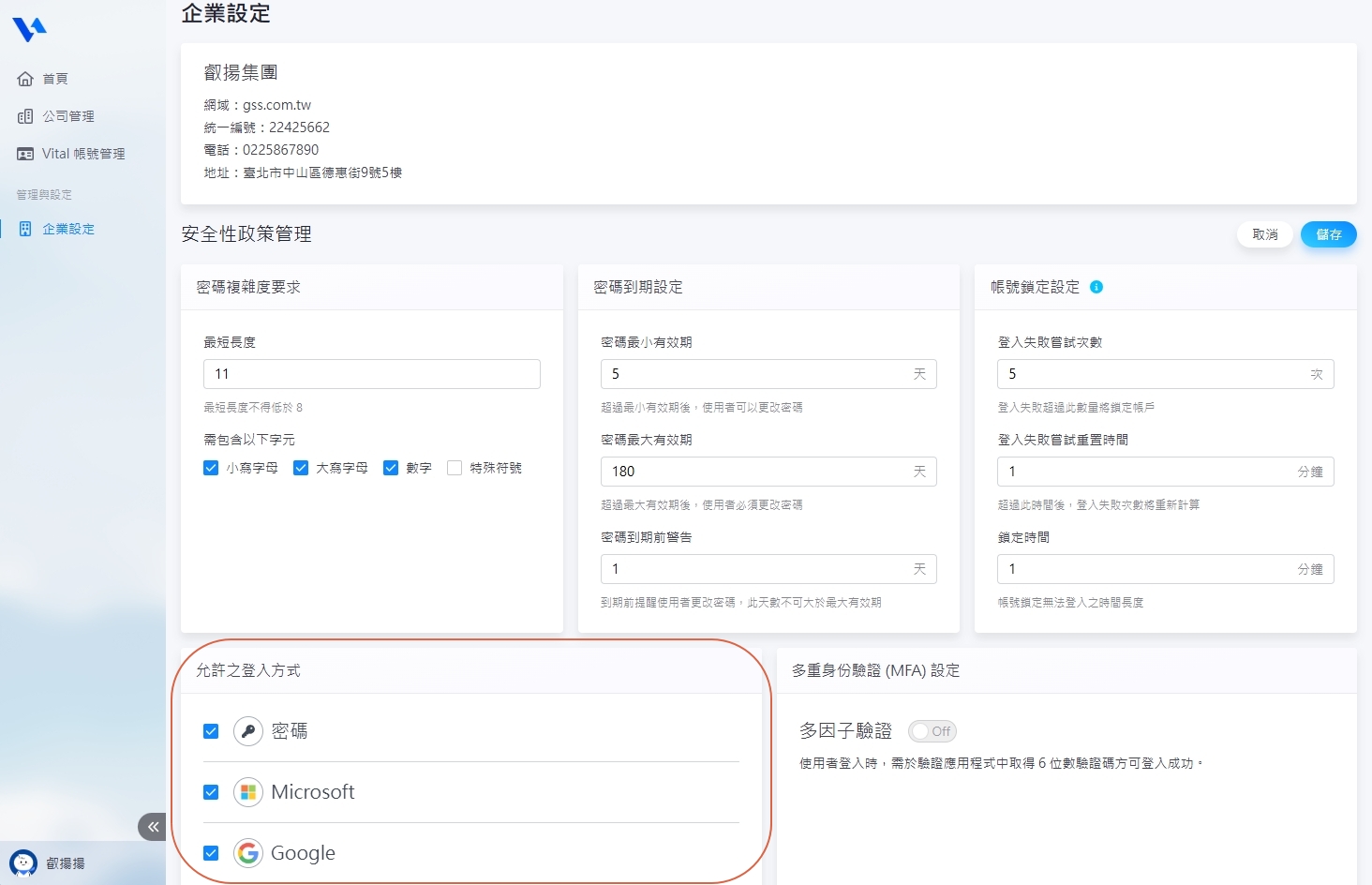 5. 【允許之登入方式】目前共有三種登入方式可複選:密碼、Microsoft、Google,請至少選擇一種。