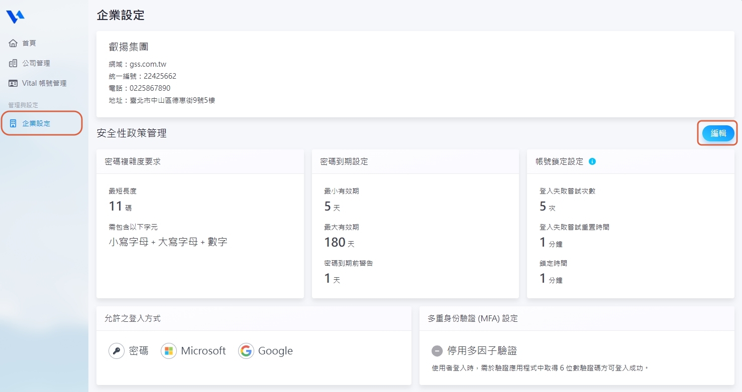 1. 請至【企業設定】檢視當前的安全性政策,點選【編輯】可進入修改。