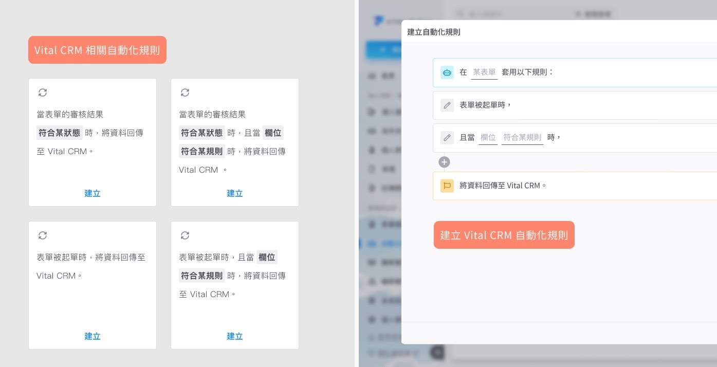 例如: 小 B 負責處理客戶訂單,當他提交一份訂單表單時,若「訂單金額」超過預設的閾值,且審核結果為「批准」,系統會自動將這筆資料傳送到 Vital CRM,讓銷售團隊能立即跟進。此外,若表單在創建時已標示為「重要客戶」,該標籤也會自動同步到 CRM,確保重要客戶不被忽略,促進更精準的客戶管理。 | |
