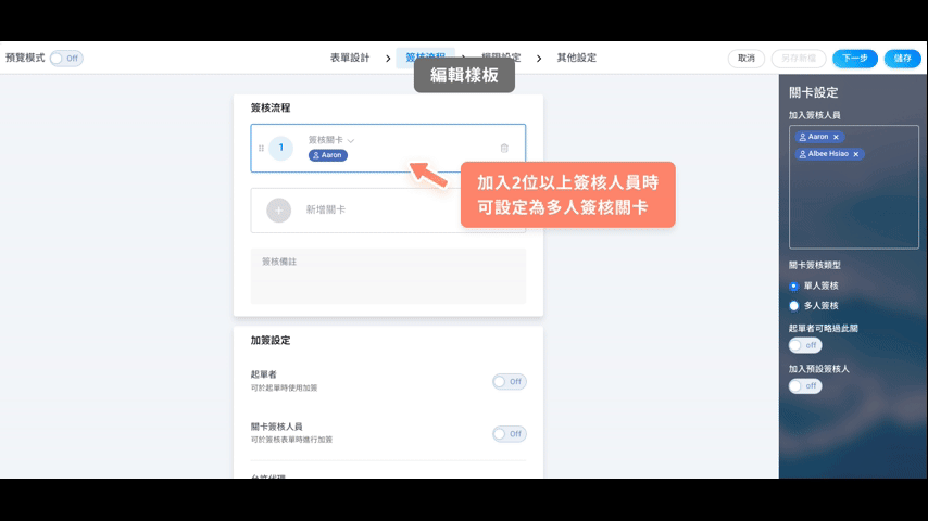 現在每一關都可以設定多位簽核人,您可以選擇「群簽」模式(需全部同意才過關),或「擇簽」模式(只要其中一位或是任一數量同意即可)。