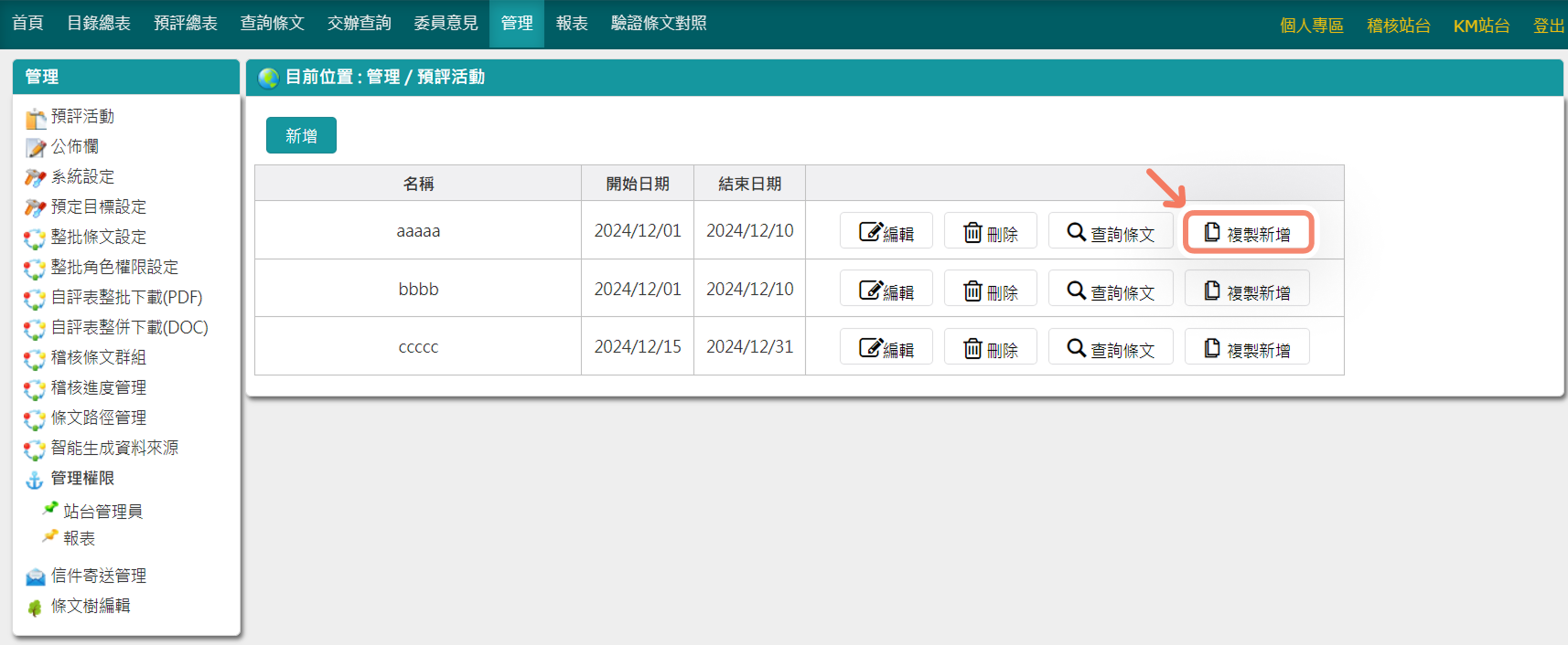 過往建立新的預評活動時,需要逐一指定日期、委員及條文,操作過程相當繁瑣。為了簡化流程,本次更新提供『複製新增』功能,使用者可直接複製既有的預評活動後再進行調整,大幅節省設定時間與精力。