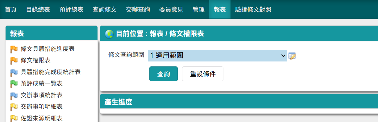 為了讓使用者能更精準地查詢佐證來源,本次更新在報表中新增了『條文查詢範圍』功能。使用者除了能查詢所有條文的佐證來源或利用關鍵字搜尋外,還可以根據自身需求,選擇特定條文來查詢其佐證資料。