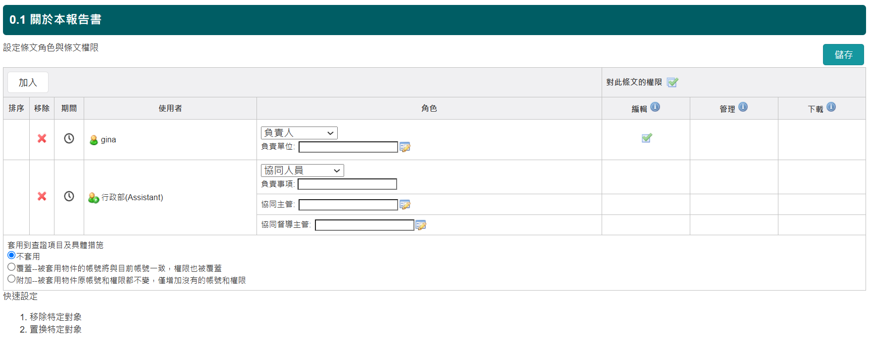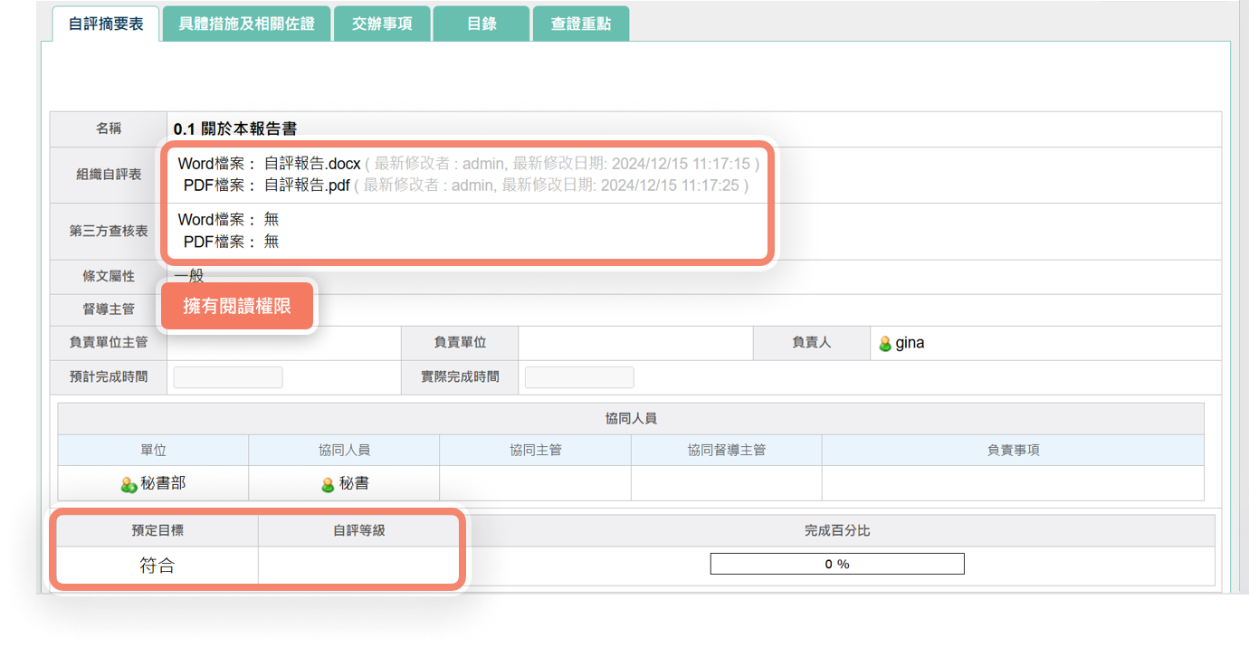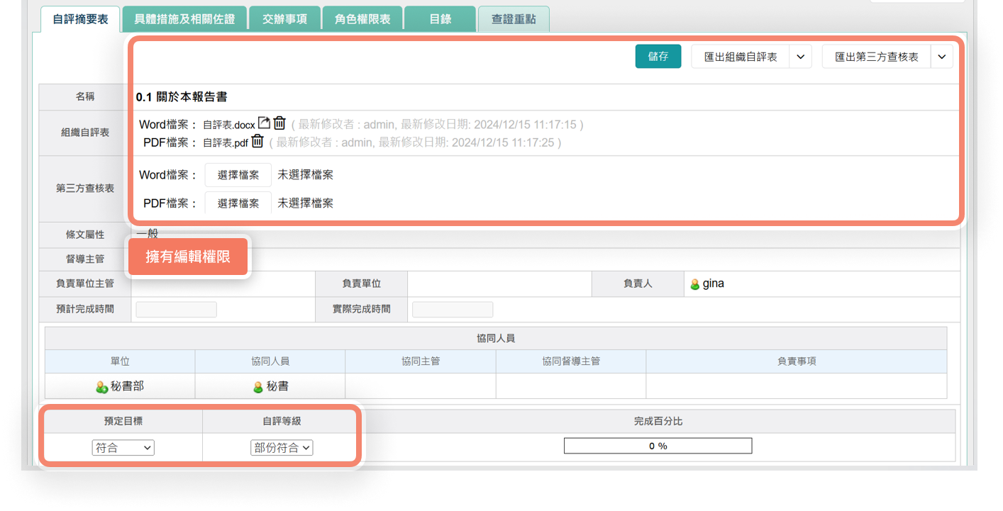 例如:有編輯權限的使用者,即可直接編輯條文目標、上傳檔案;未具備權限的使用者,則不會出現此功能。