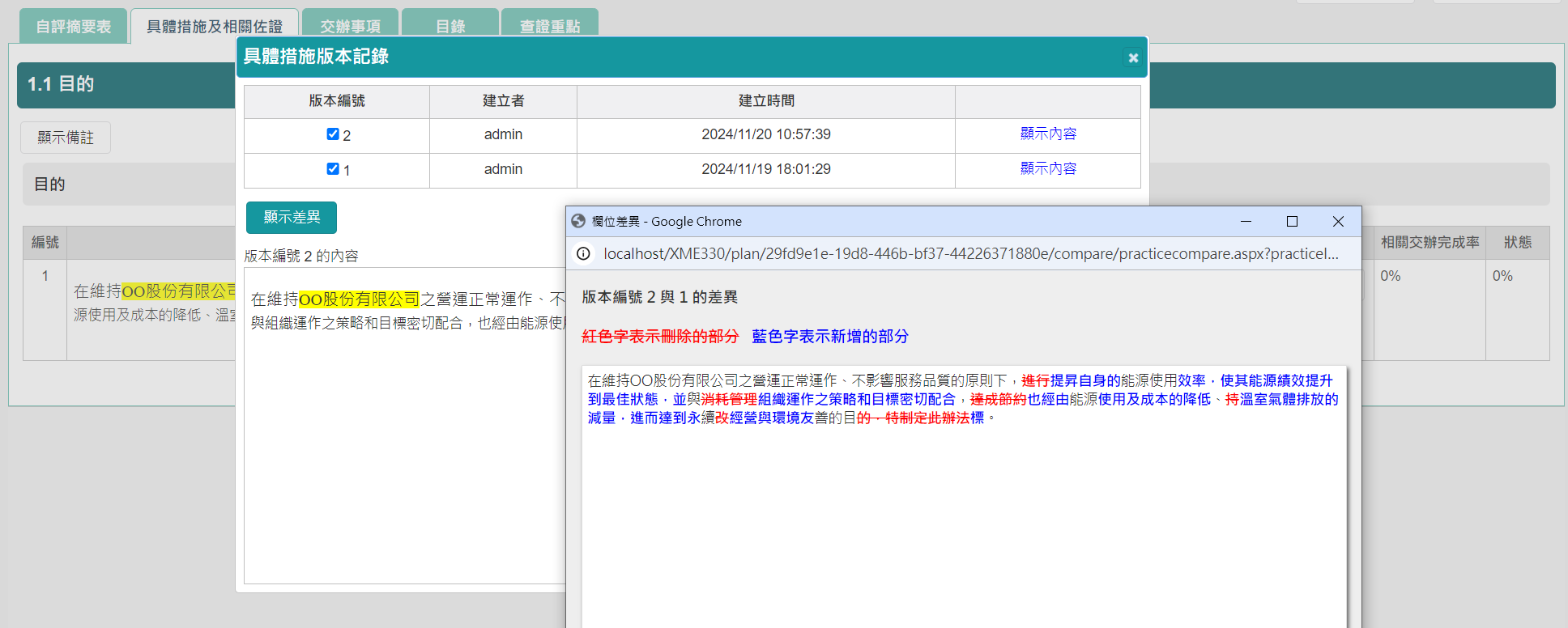 增加具體措施的版本記錄功能,詳細記錄每次修改的具體措施內容,並提供版本間的差異比對功能,方便使用者追蹤。