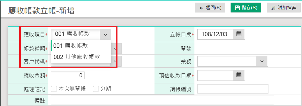 原固定為「應收帳款」,未提供選擇。新增「應收項目」欄位後,用戶可自行設定多種應收項目;相關設定說明如後。
