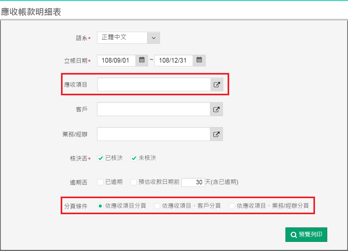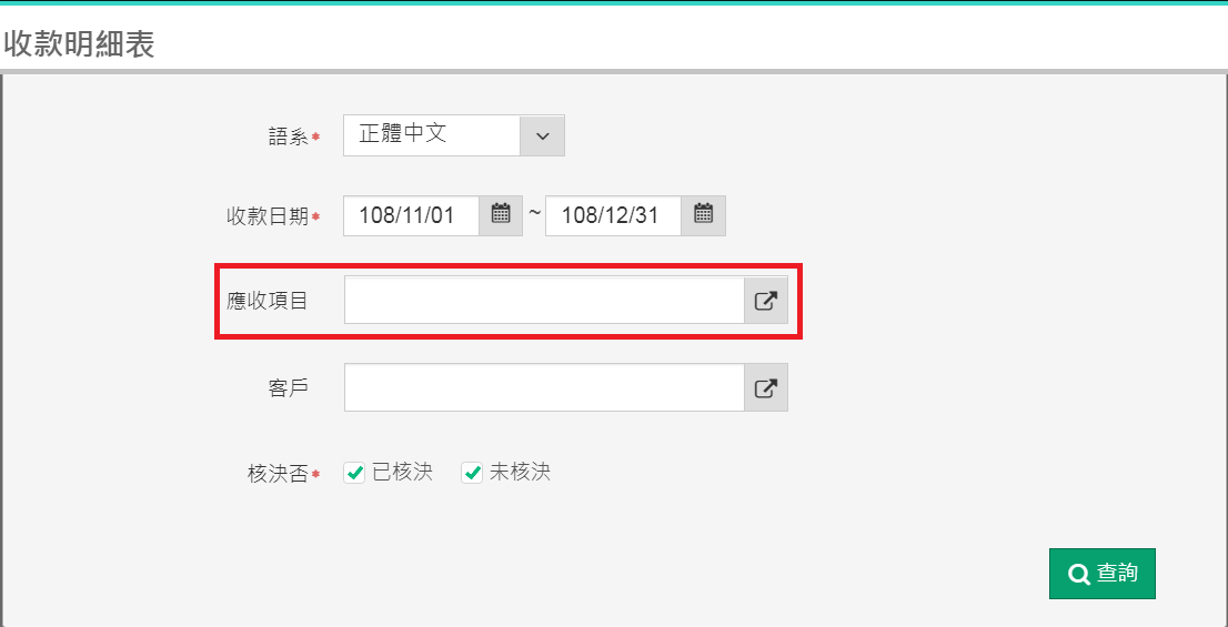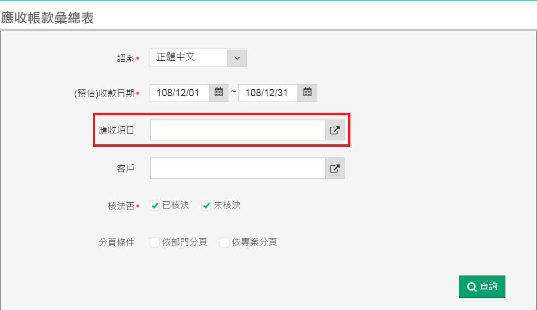 新增查詢條件「應收項目」、「應付項目」,以下以應收帳款做說明。