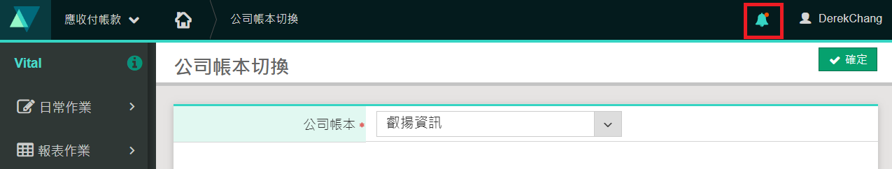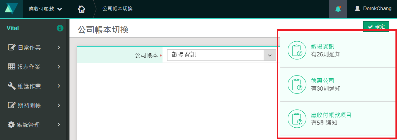 在您初登入系統,尚未選擇公司帳本時,通知訊息是顯示:各公司帳本的當月待收款及待付款總筆數。