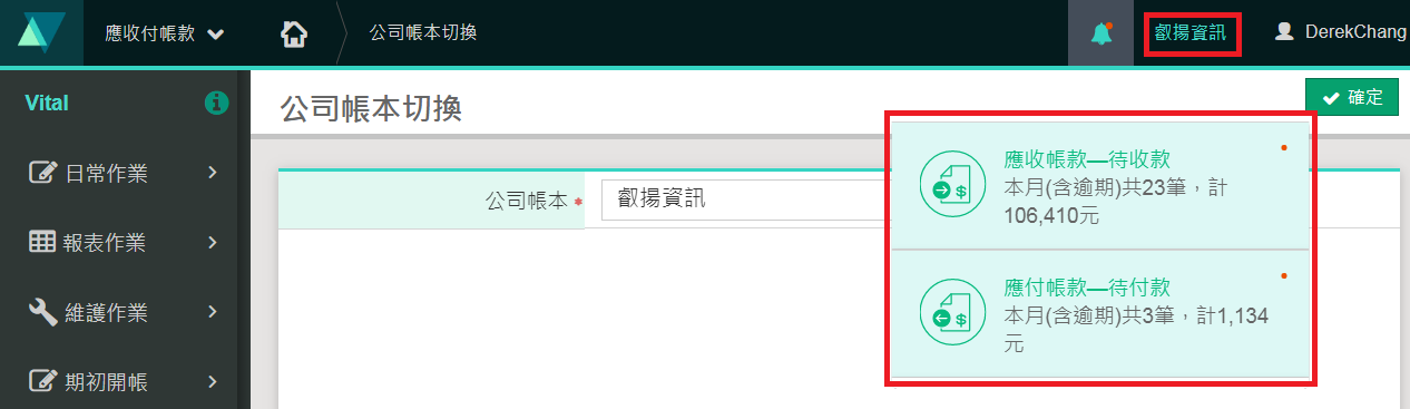 在您已選有公司帳本的情境下,通知訊息是顯示:該公司帳本的當月應收帳款-待收款、當月應付帳款-待付款之總筆數。