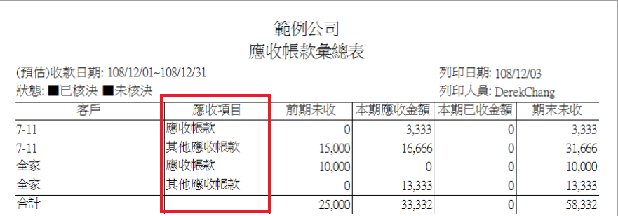 應收帳款彙總表新增加「應收項目」欄位,報表範例如下: