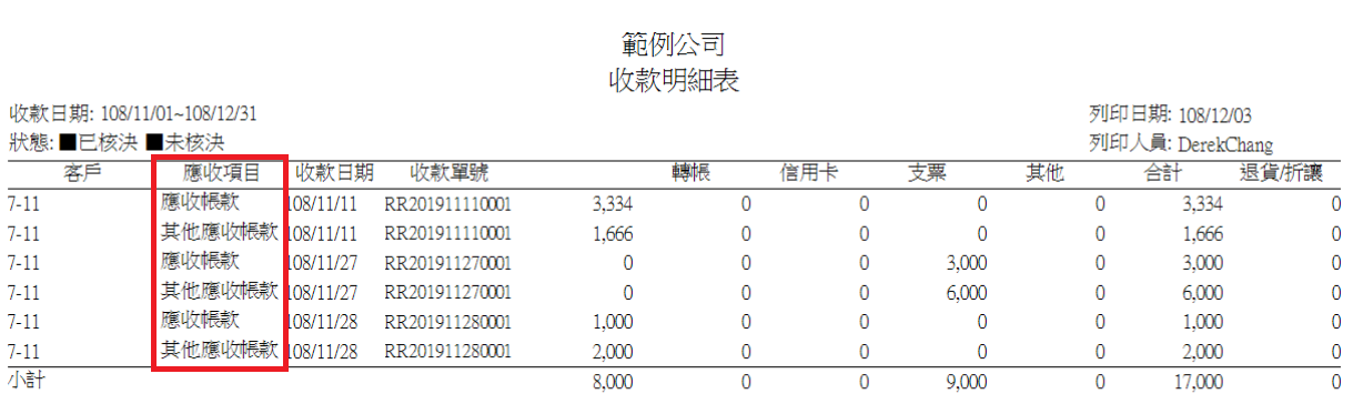 收款明細表新增加「應收項目」欄位,報表範例如下: