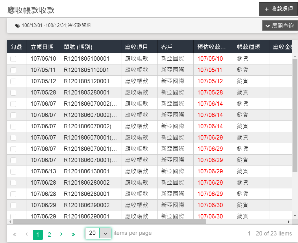 新增查詢條件「應收項目」、「應付項目」及分頁條件,以下以應收帳款做說明。
