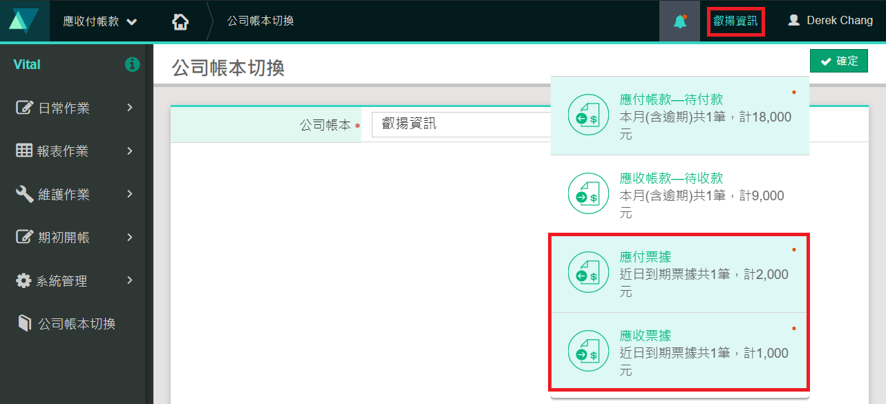 - 在選擇公司帳本時,增加顯示該公司帳本對應的應收/付票據資訊。