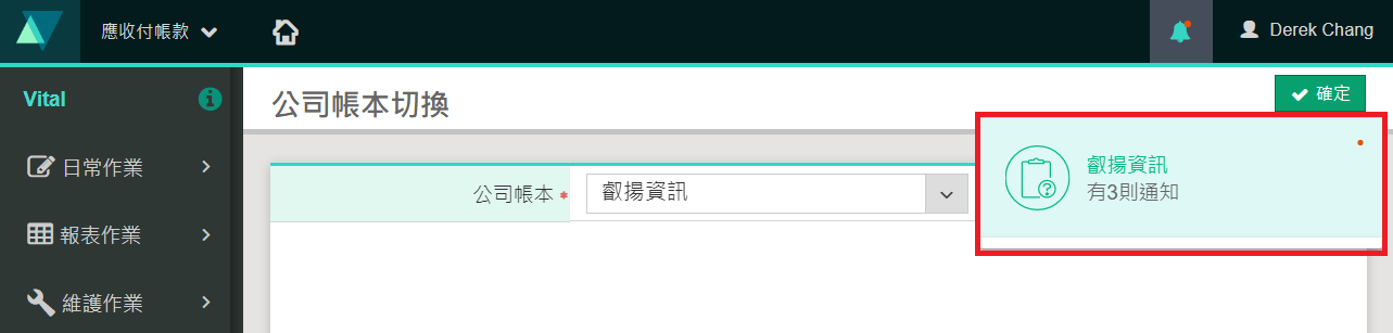 - 在您尚未選擇公司帳本時,顯示各公司帳本對應的應收待收款、應付待付款及應收/付票據提醒訊息之總筆數。