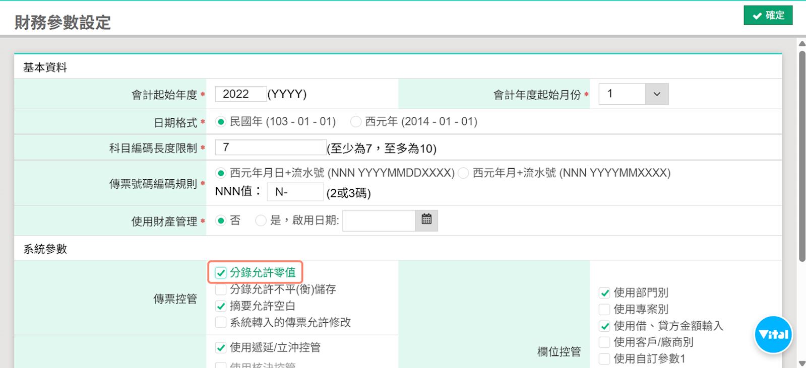 如作業上有儲存零值的需求,可於維護作業>財務參數設定,勾選「分錄允許零值」。