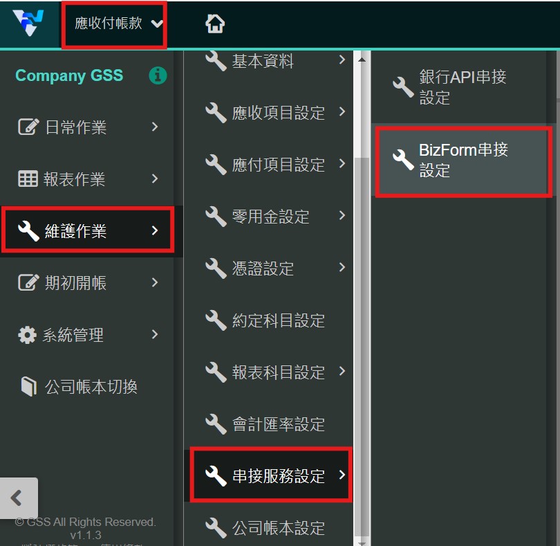 【應收付帳款】維護作業>串接服務設定>BizForm 串接設定