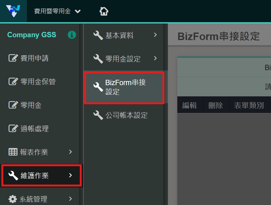 *BizForm 串接功能目前開放應收付帳款模組、費用暨零用金模組使用。 作業位置: 【應收付帳款】維護作業>串接服務設定>BizForm 串接設定 【費用暨零用金】維護作業>BizForm 串接設定