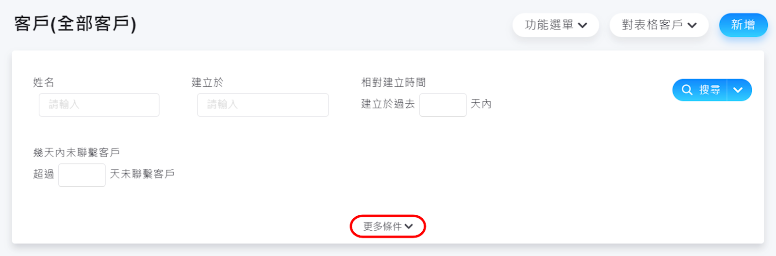1. 由列表左上方【客戶】進入,上方即可看見搜尋功能,點選【更多條件】展開其他查詢條件。