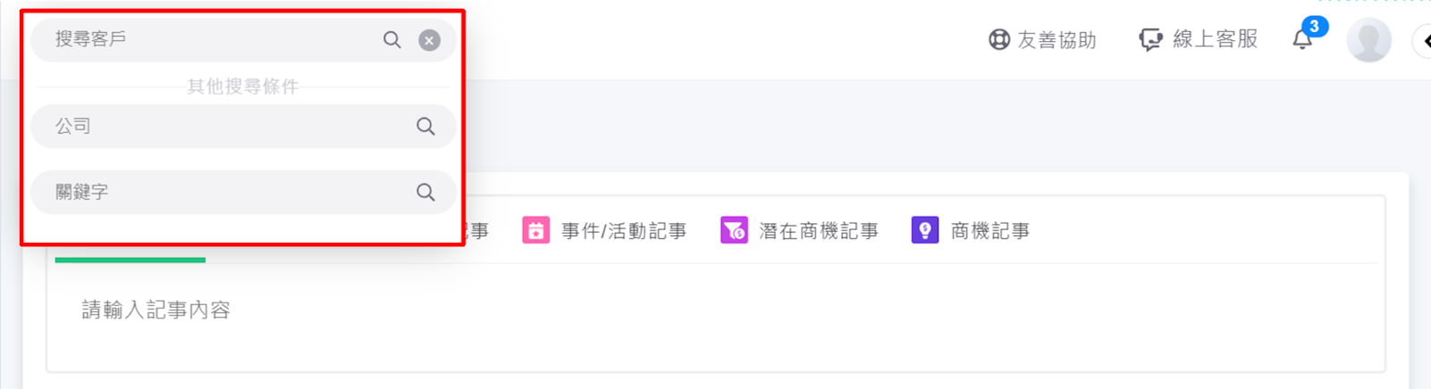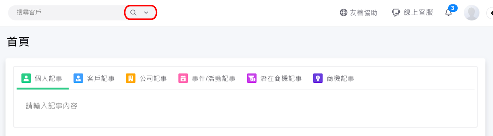 在系統首頁畫面左上角,即可見到放大鏡圖示,點擊旁邊的【v】按鈕,可自由選擇其他搜尋條件,包含【搜尋客戶】、【公司】與【關鍵字】。