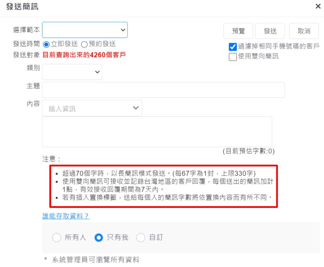 3. 若有插入置換標籤,送給每個人的簡訊字數將依置換內容而有所不同,建議您發送前先預覽簡訊內容。