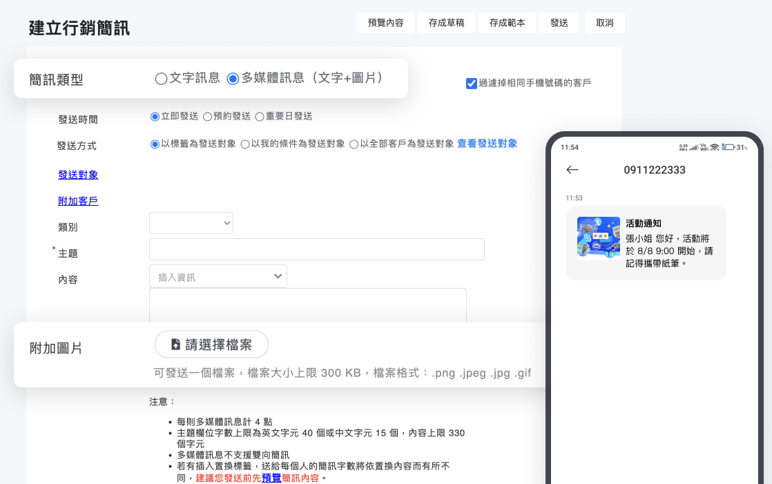 建立行銷簡訊時,可以選擇訊息為「文字訊息」或「多媒體訊息(文字+圖片)」,文字訊息為原有的 SMS 文字簡訊,而多媒體訊息(文字+圖片)則可以輸入欲發送的簡訊主題、文字內容與附加圖片。