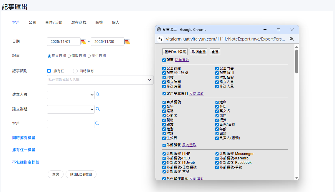 選擇記事類型(客戶/公司/事件活動/潛在商機/商機/個人),輸入條件查詢後,勾選需要的欄位進行匯出: