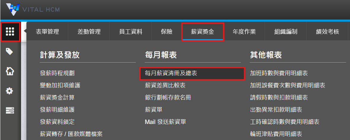1. 請至【全站功能】>【薪資獎金>每月薪資清冊及總表】。