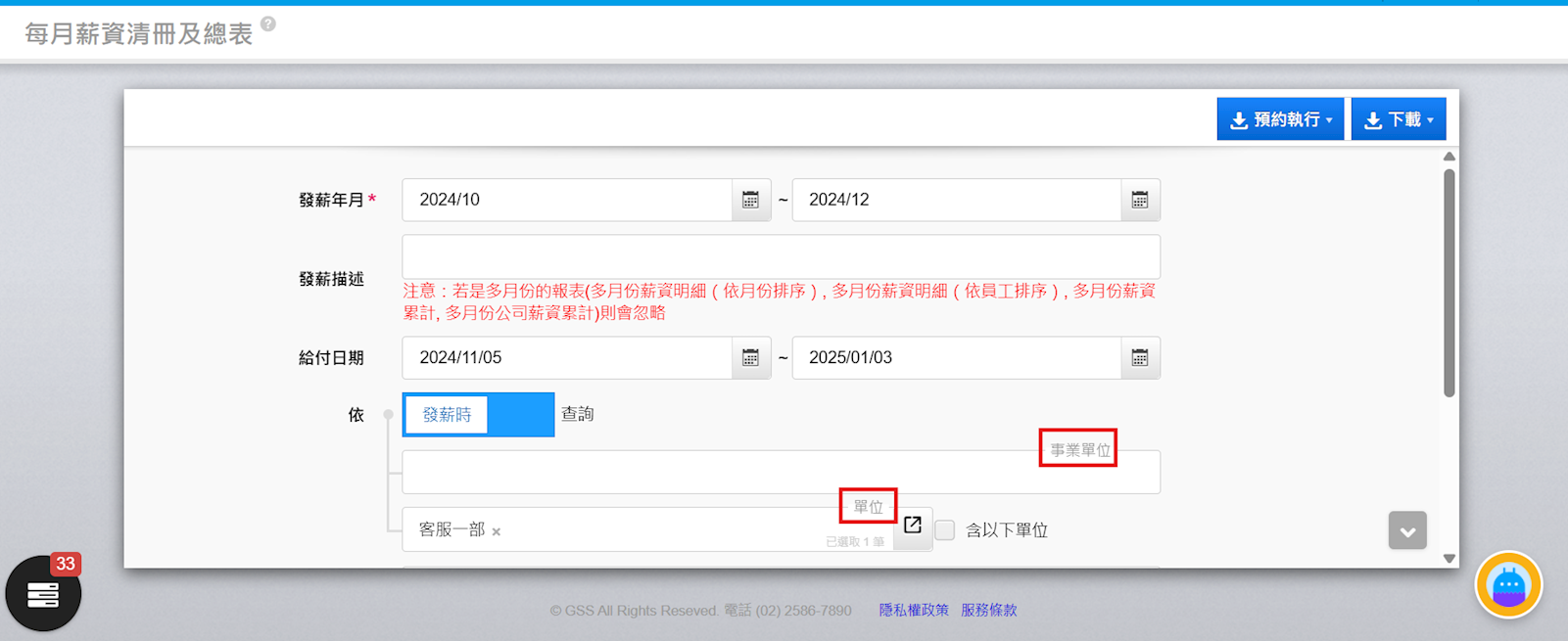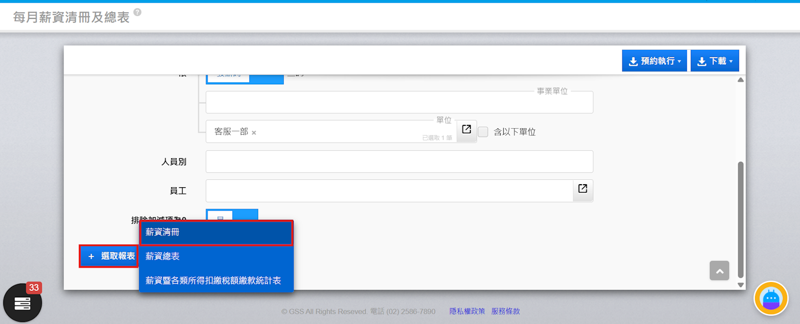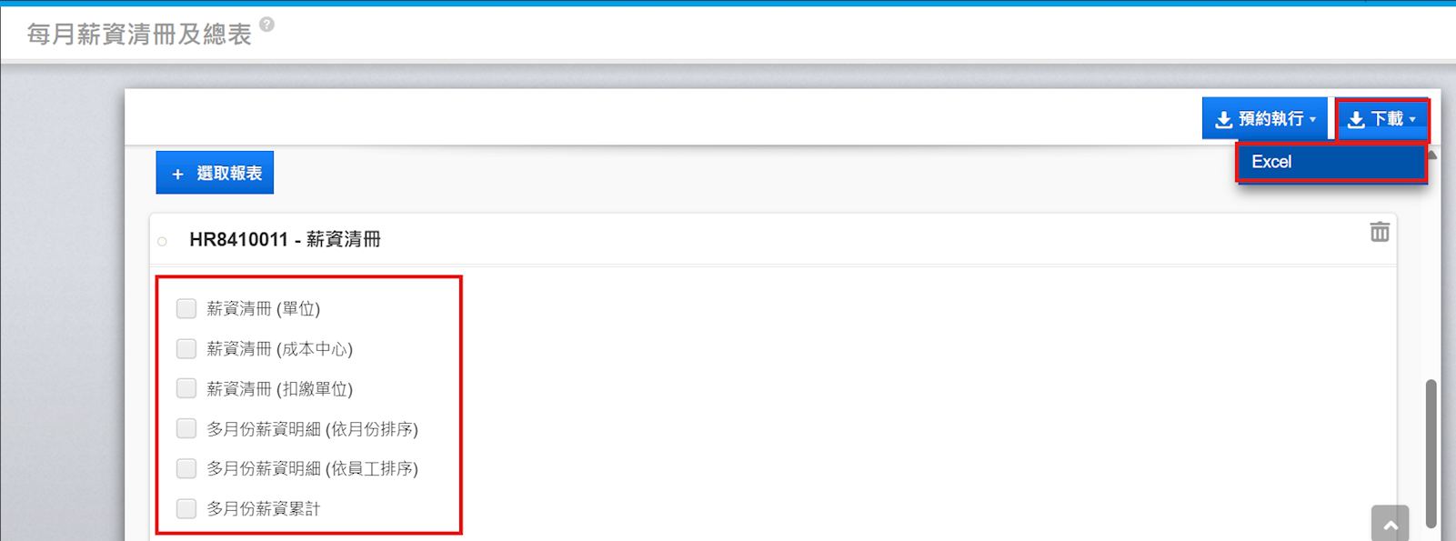 4. 勾選薪資清冊報表種類,可依需求選擇以單位、成本中心、扣繳單位呈現,完成後按【下載>Excel】即可。