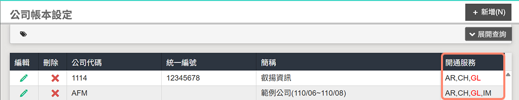 在公司帳本設定中可以看到各個公司帳本已開通服務,紅字代表目前所切換到的模組,以下說明縮寫代表模組: