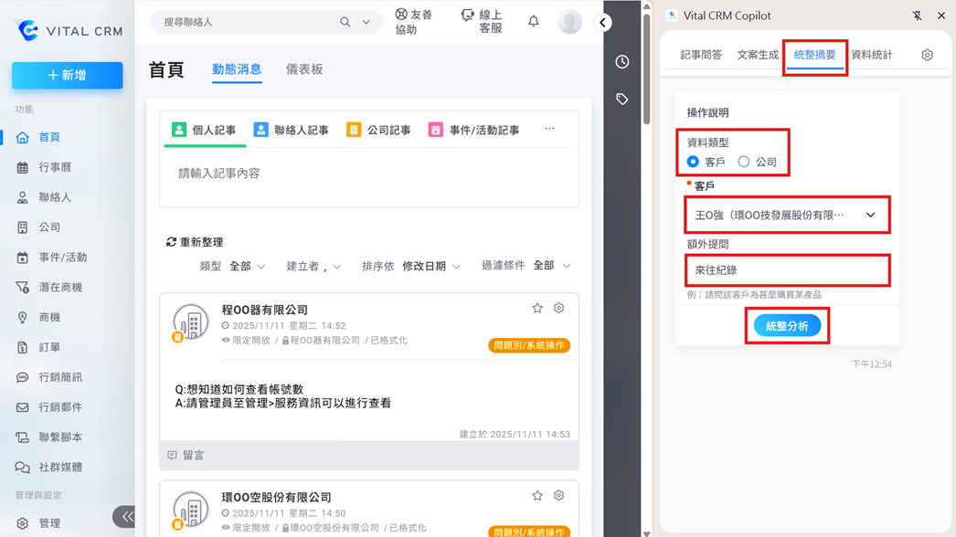 點選【統整摘要】,設定要統整的資料類型為"客戶",並在【額外提問】輸入prompt後,點選【統整分析】即會出現對應內容。.png)