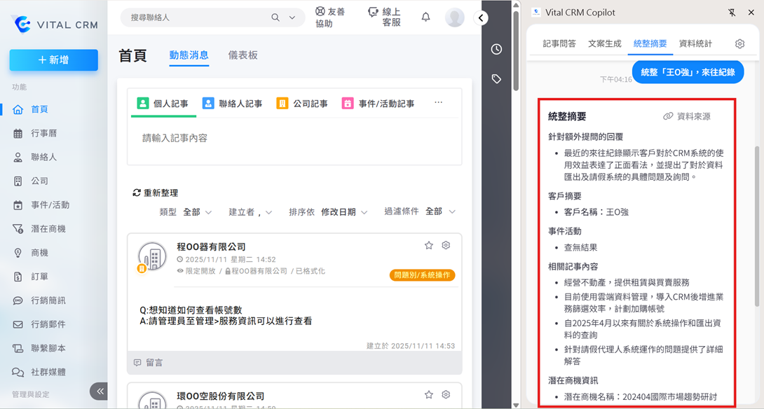 *情境說明:詢問與某客戶的來往紀錄,系統即統整出相關記事內容與潛在商機紀錄,方便快速一覽與該客戶相關的所有資料。.png)