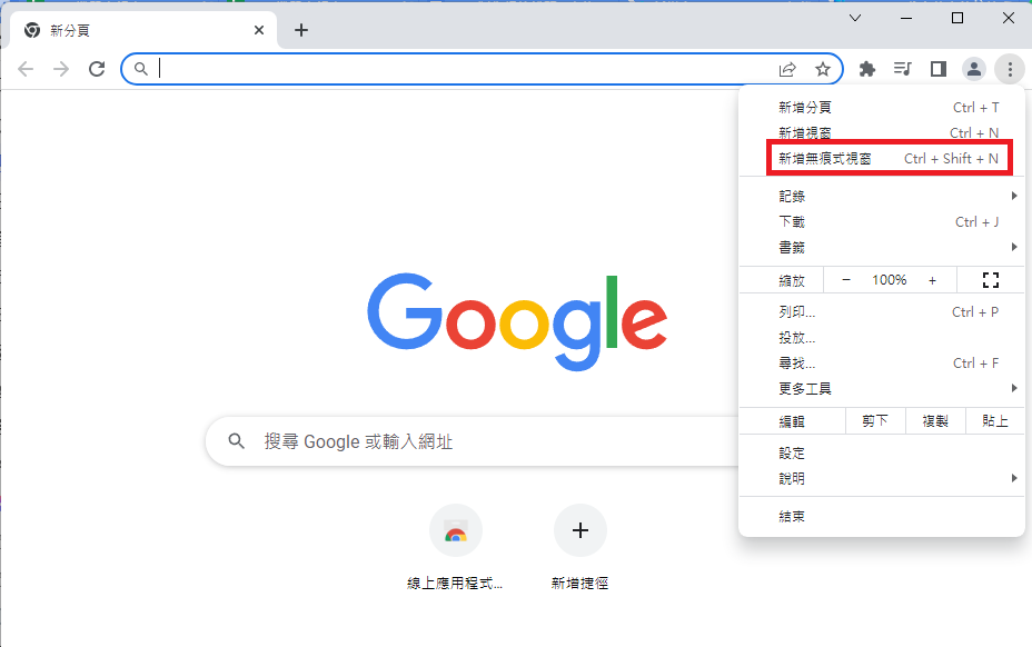 1. 請開啟無痕視窗,使用「無痕模式」登入(此處以Google Chrome為例)
