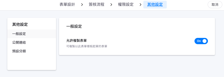 進入編輯畫面後,切換到「其他設定」頁籤,並於「一般設定」畫面中將「允許複製表單」按鈕開啟或關閉。