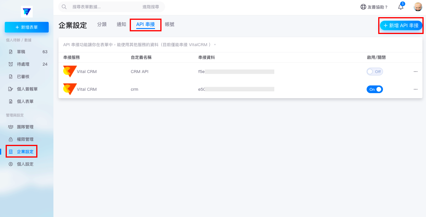 2. 在 BizForm 系統中,點擊【企業設定>API 串接】,接著,點擊頁面右上方的「新增 API 串接」。