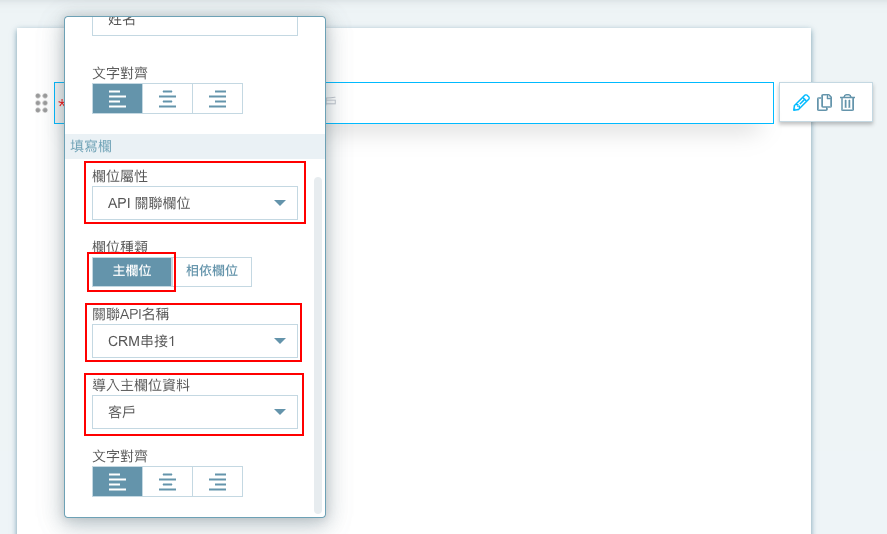 1. 主欄位:點開欲設定的欄位,請在「欄位屬性」選擇「API 關聯欄位」,「欄位種類」請選擇為「主欄位」;接下來請選擇欲關聯的 API 名稱(若系統中串接多個 CRM,請確認所選擇的服務無誤),最後選擇導入主欄位的資料。
